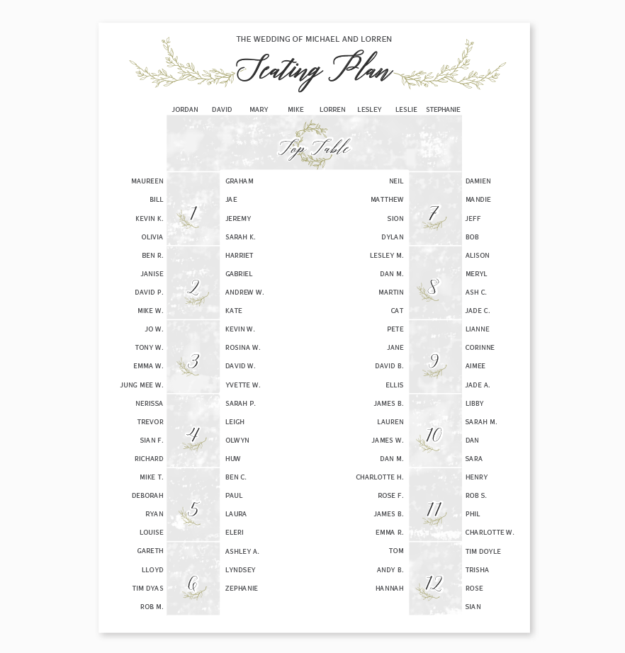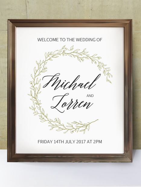 Wedding day graphic design including; welcome sign, table numbers, name places, and a seating plan which was printed onto A2 card and displayed on an easel.