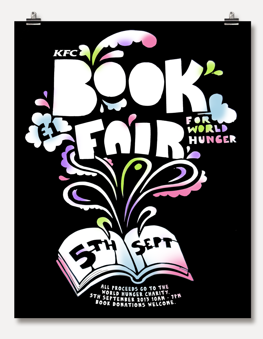 In-store charity promotion, raising money for World Hunger. Top: hand cut black card overlayed onto thin white paper with random colour pattern. This was displayed in the store over a light box.